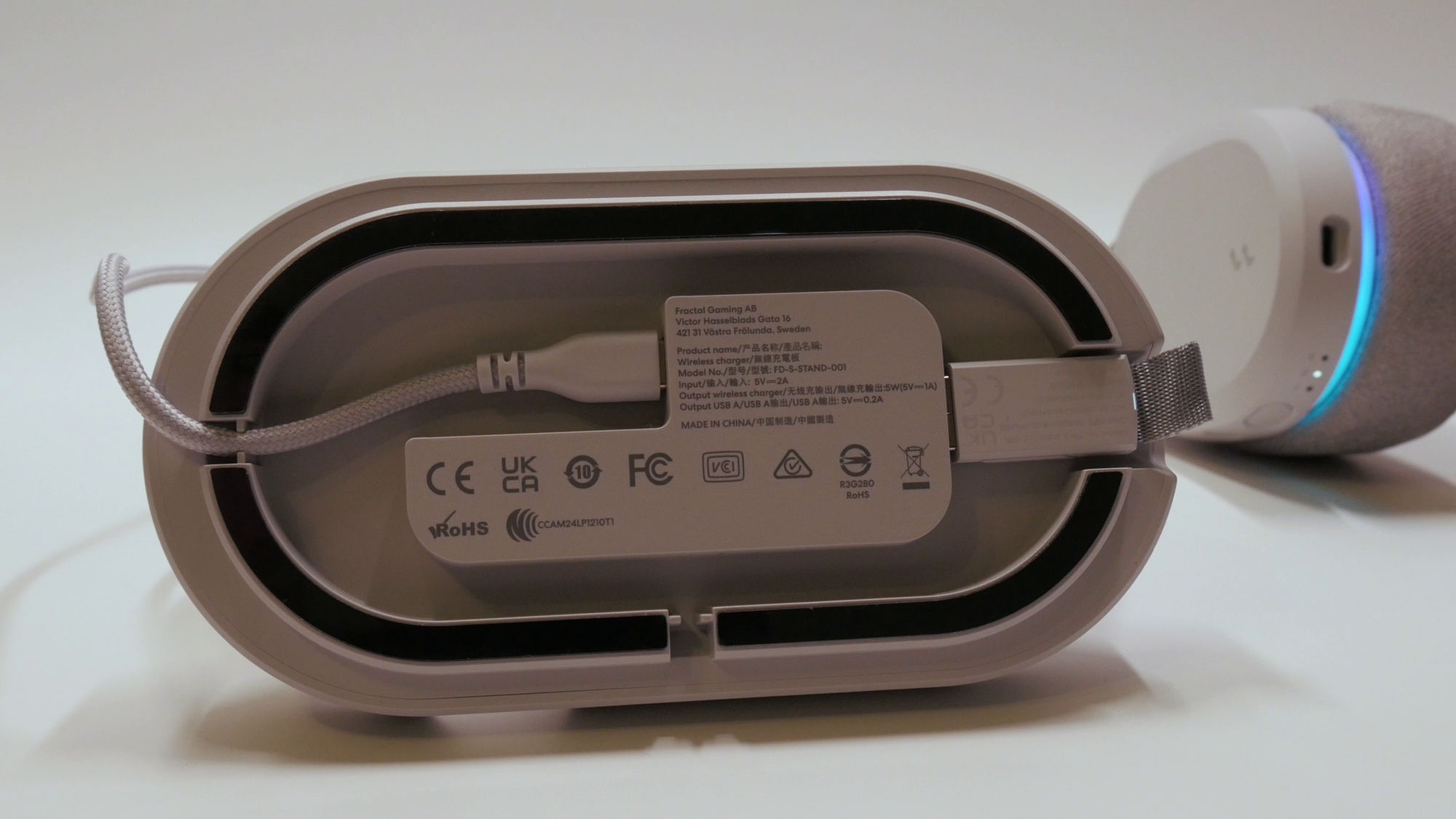 Praktisch: Der 2,4-GHz-Dongle ist direkt im Dock integriert und kann für Reisen einfach entnommen werden. Weniger praktisch ist, dass die Station etwas leichter sein könnte, da das Headset beim Abnehmen manchmal die Basis leicht mitzieht.
