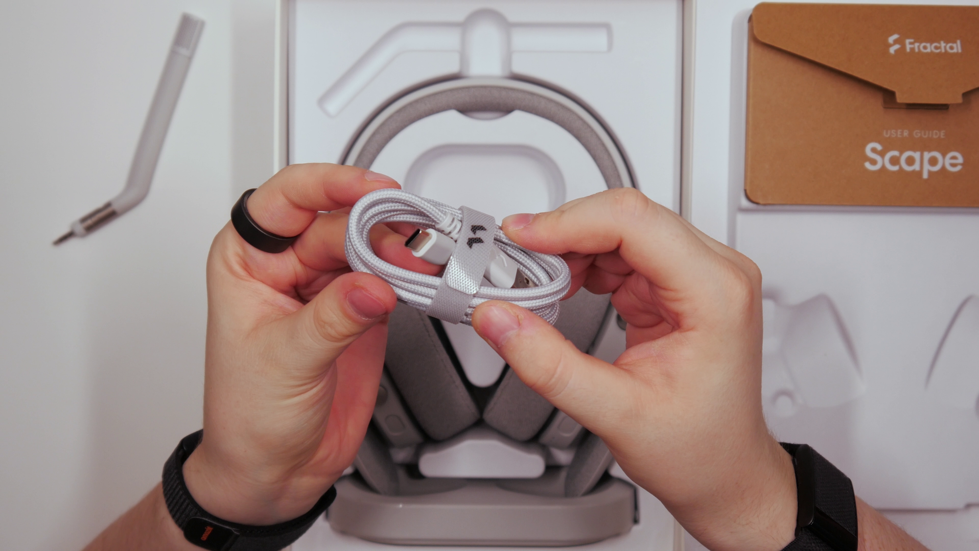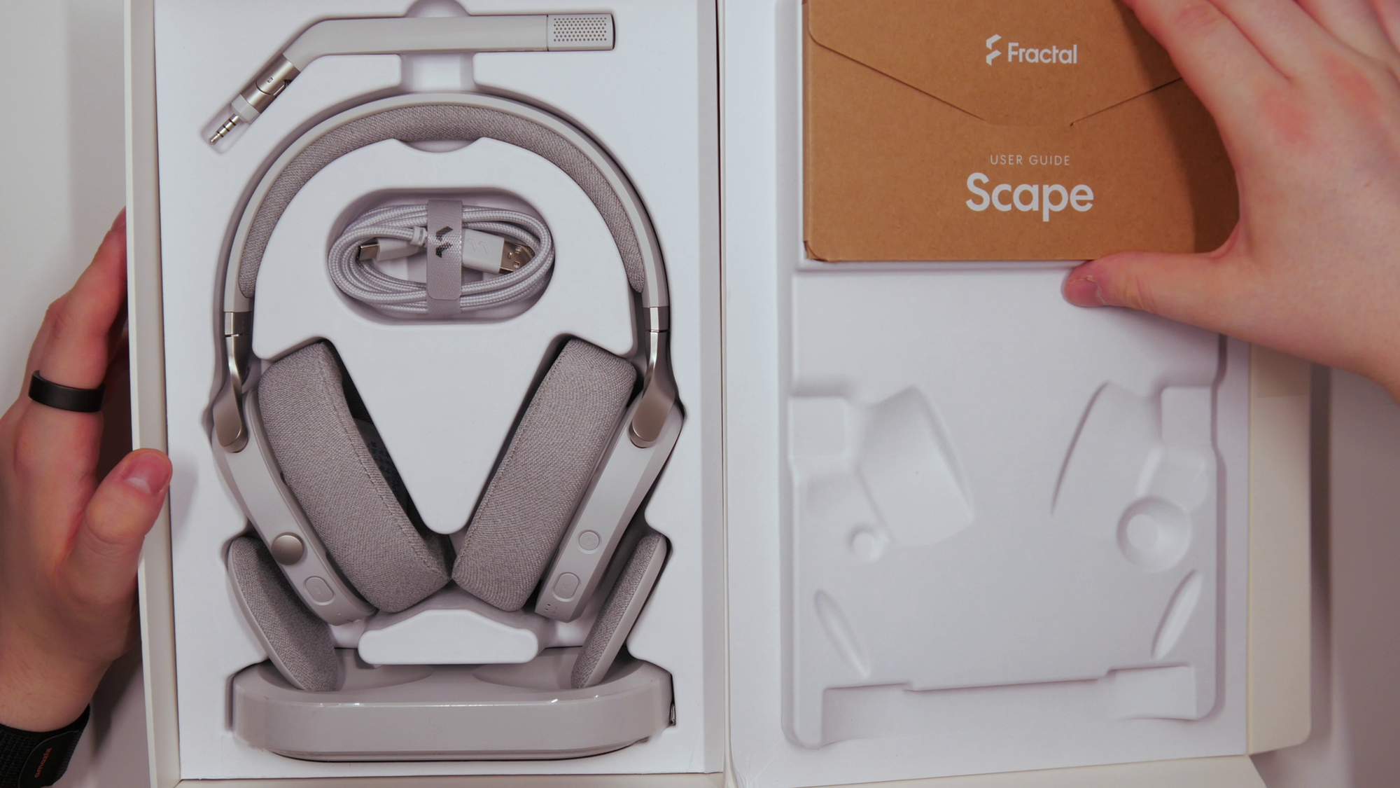 Schon beim Öffnen der Verpackung wird klar, dass Fractal auf ein bewusst schlichtes, aber edles Präsentationskonzept setzt. Das Headset liegt sauber eingebettet in einer stabilen Box mit eingraviertem „Scape“-Schriftzug. Im Lieferumfang finden sich: