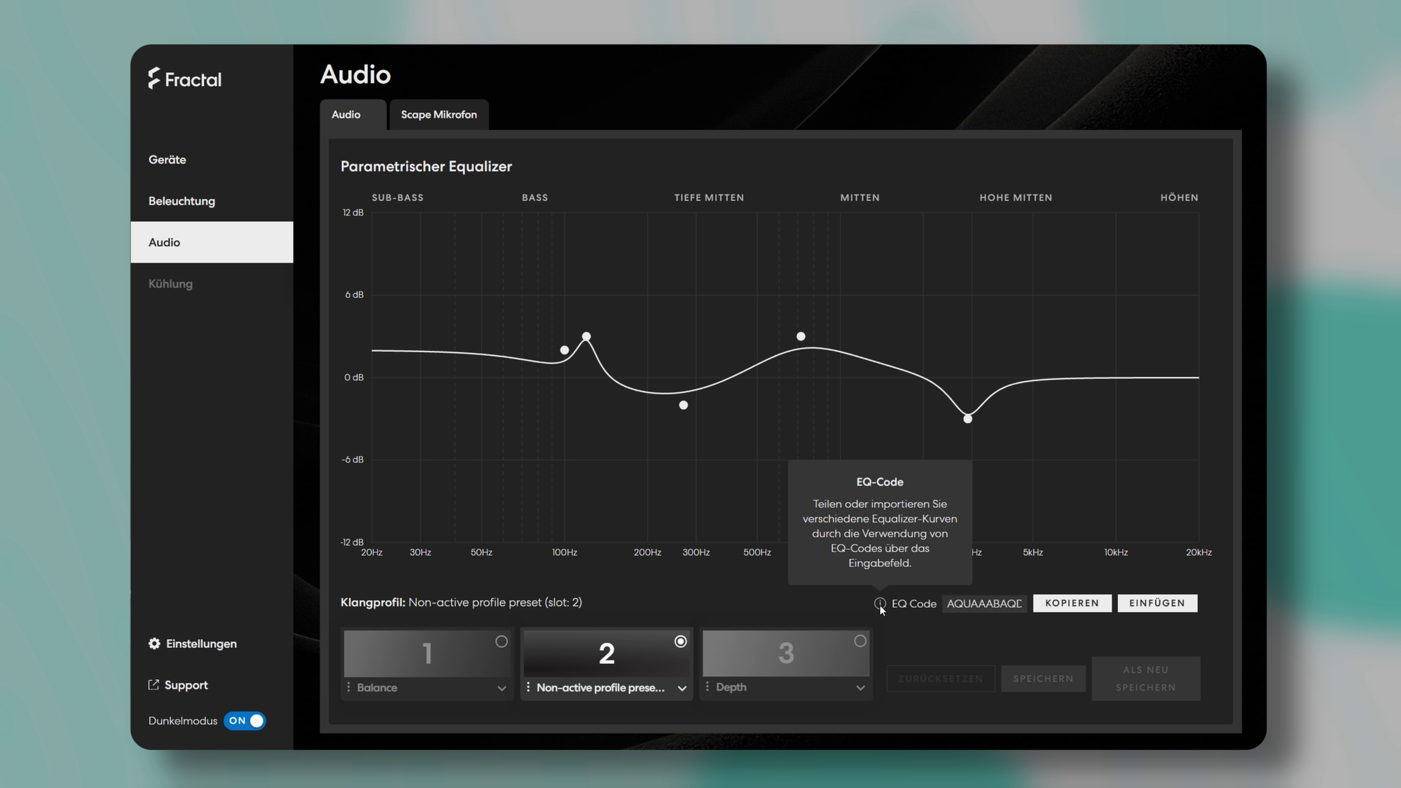 Anpassungen erfolgen über die webbasierte Adjust-Pro-App von Fractal, die jedoch nur in Chromium-basierten Browsern funktioniert. Der parametrische EQ ist extrem detailliert, speichert Profile direkt auf dem Headset und erlaubt den Export/Import über Code – ein starkes Feature für Audio-Enthusiasten.
