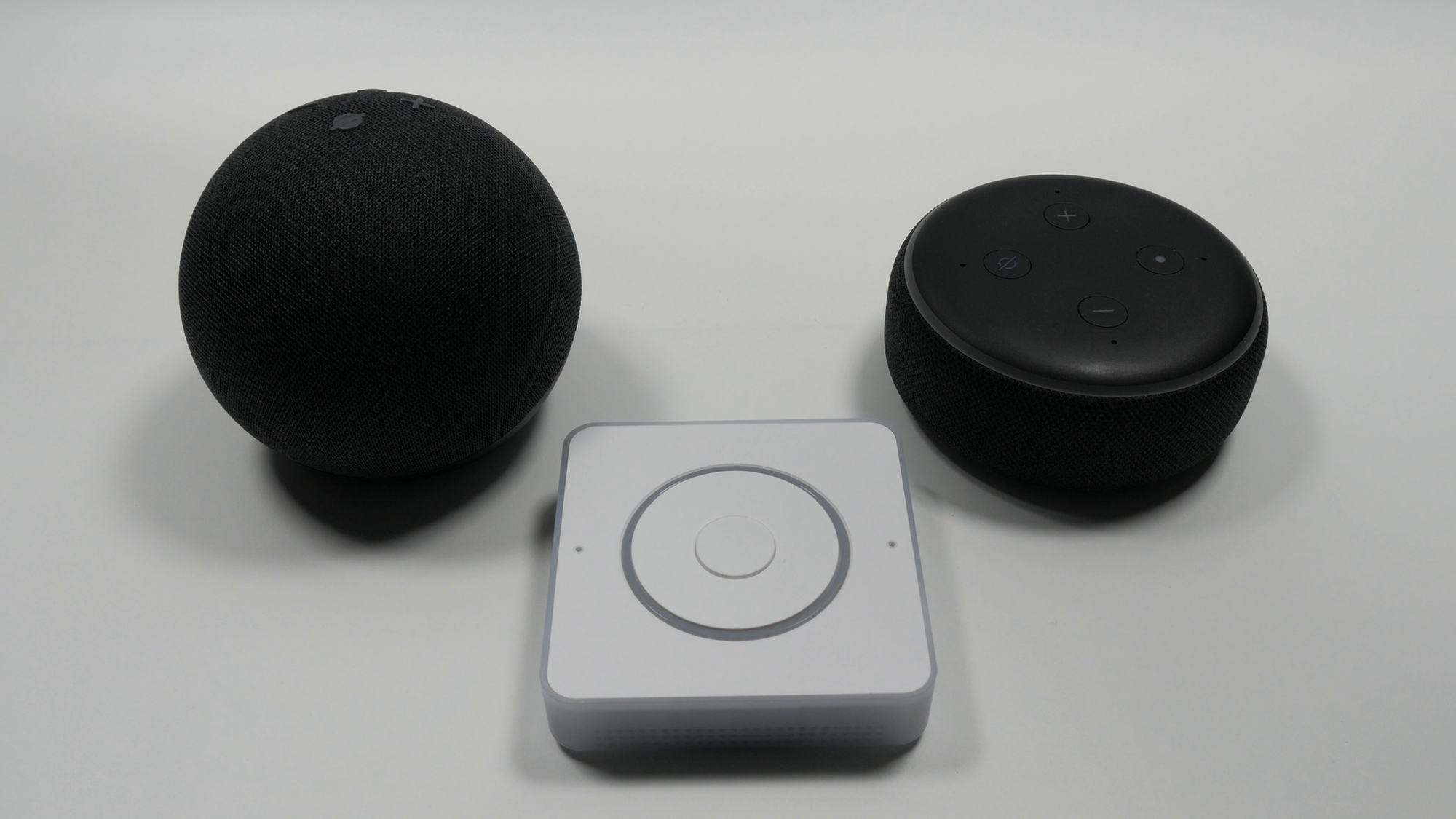 Vergleich zu Amazon Echo Dot-Geräten (links) | Drehrad für Lautstärke (rechts)