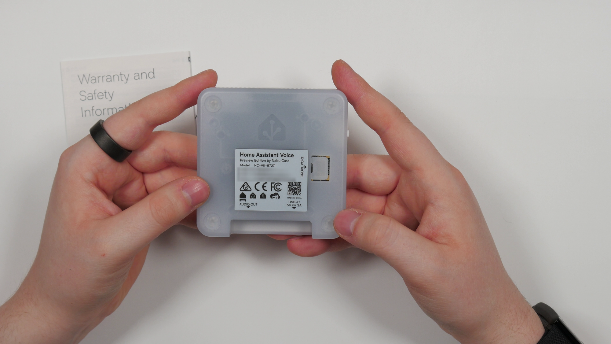 Die „Home Assistant Voice Preview Edition“ wird in einer unscheinbaren Verpackung der Open Home Foundation und Nabu Casa geliefert. Da nur wenig Zubehör beiliegt, wird schnell klar, dass der Fokus auf Funktionalität liegt. Neben einem Quickstart-Guide und etwas Papierkram befindet sich lediglich das Gerät selbst im Karton. Ein USB-C-Kabel oder ein Netzteil sind nicht enthalten, was besonders für Einsteiger enttäuschend sein kann.