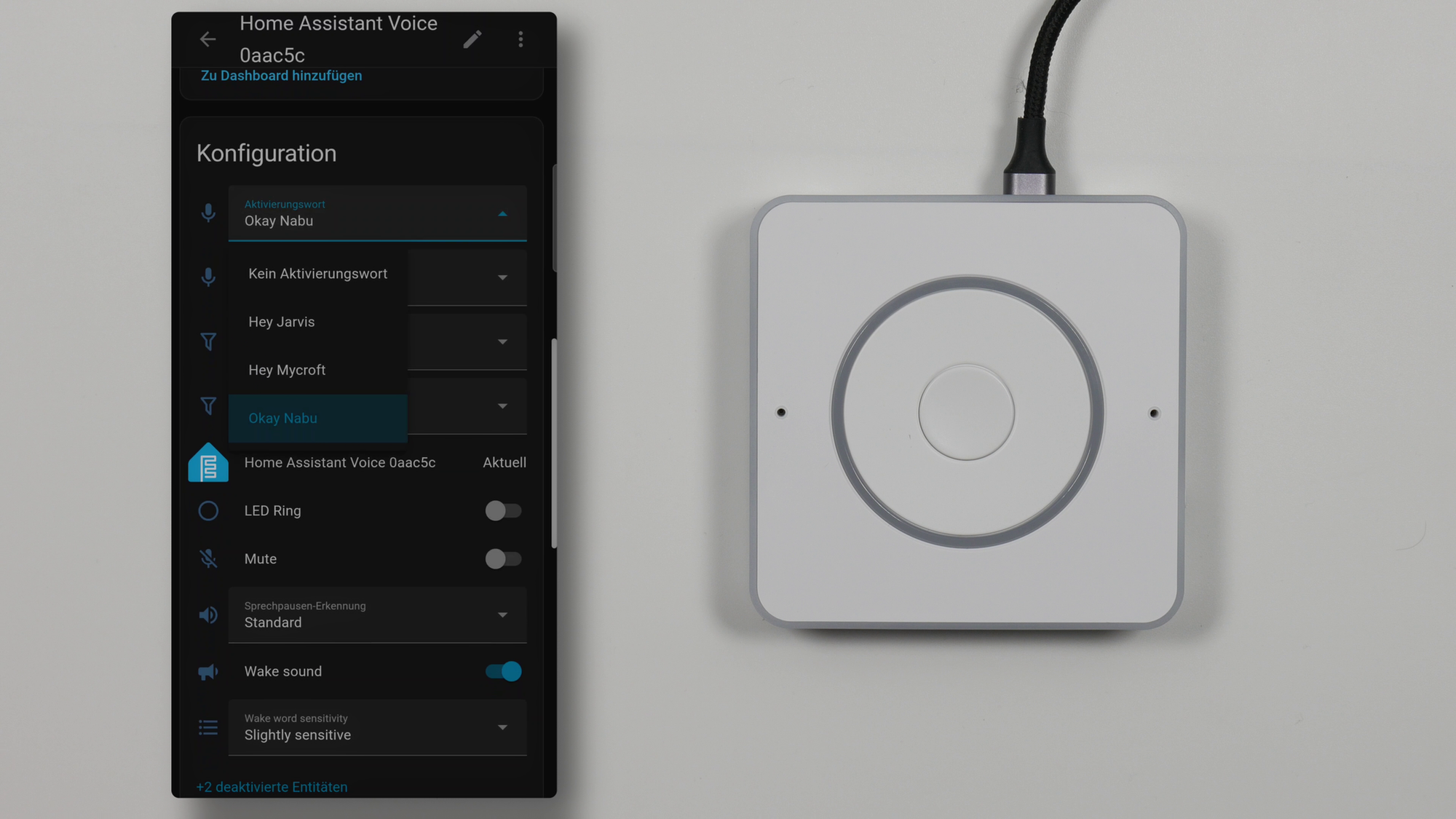 Nach der Einrichtung wird schnell klar, wo die große Stärke des Systems liegt. Nahezu jeder Aspekt des Sprachassistenten lässt sich anpassen. Das beginnt beim Aktivierungswort, das nicht auf einen einzigen Begriff festgelegt ist. Neben „Okay Nabu” stehen weitere Optionen zur Verfügung und es ist sogar möglich, zwei Wakewords gleichzeitig zu nutzen. Auch die LED-Helligkeit, die Mikrofonempfindlichkeit, die Pausenerkennung und das akustische Feedback lassen sich feinjustieren.