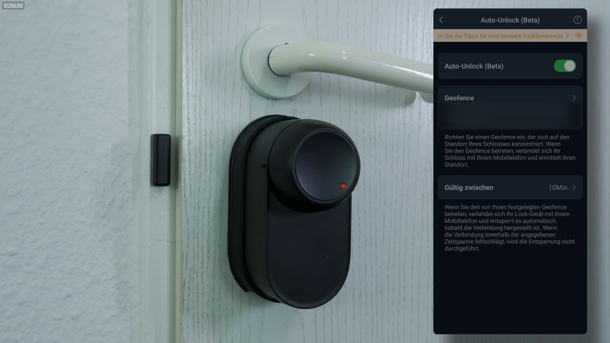 Eine weitere Entsperrmethode, die ich regelmäßig nutze, ist „Auto-Unlock”. Die Funktion ist in der App noch als Beta markiert, funktioniert im Alltag aber wirklich gut. Das Prinzip ist folgendes: Man legt einen Geofence-Bereich fest. Sobald man diesen Bereich betritt, wird das Schloss quasi „scharf geschaltet” und öffnet automatisch, sobald man sich ihm nähert. Man muss also nichts anfassen, kein Display entsperren oder einen Fingerabdruck scannen, sondern kann einfach heran treten und das Schloss öffnet sich. Allerdings muss man den Geofence-Bereich auch vollständig verlassen haben. Ein kurzes Hinausgehen zum Briefkasten oder in den Keller funktioniert also nicht.