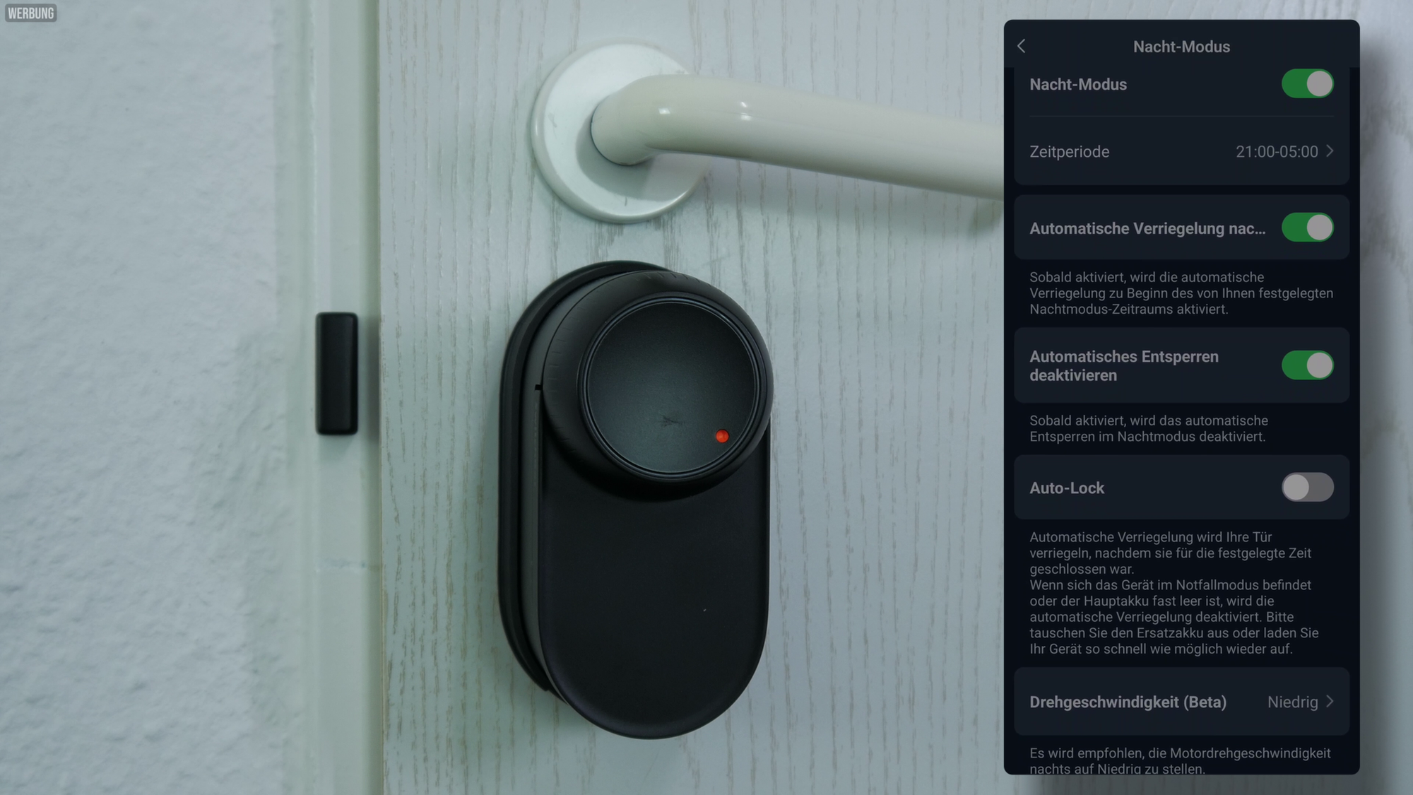 Ich habe außerdem einen Nachtmodus ab 21 Uhr eingestellt. Das Schloss schließt sich automatisch und im lautlosen Modus. Das hat bisher zuverlässig funktioniert. Einmal gab es einen kleinen Bug: Nach dem Öffnen und Wiederschließen der Tür blieb das Schloss entgegen der Auto-Lock-Einstellung unverriegelt. Das war jedoch ein Einzelfall.