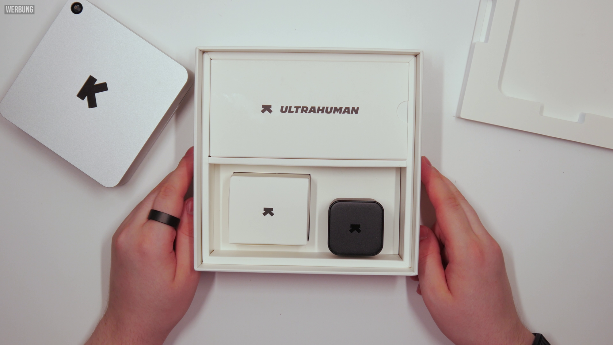 Unboxing mit Ladekabel und Netzteil (links) | Ultrahuman HOME angeschaut (rechts)