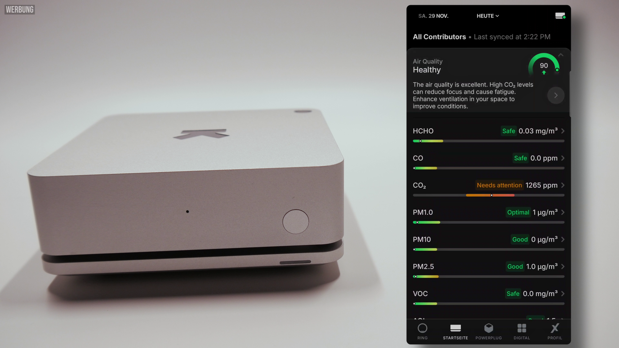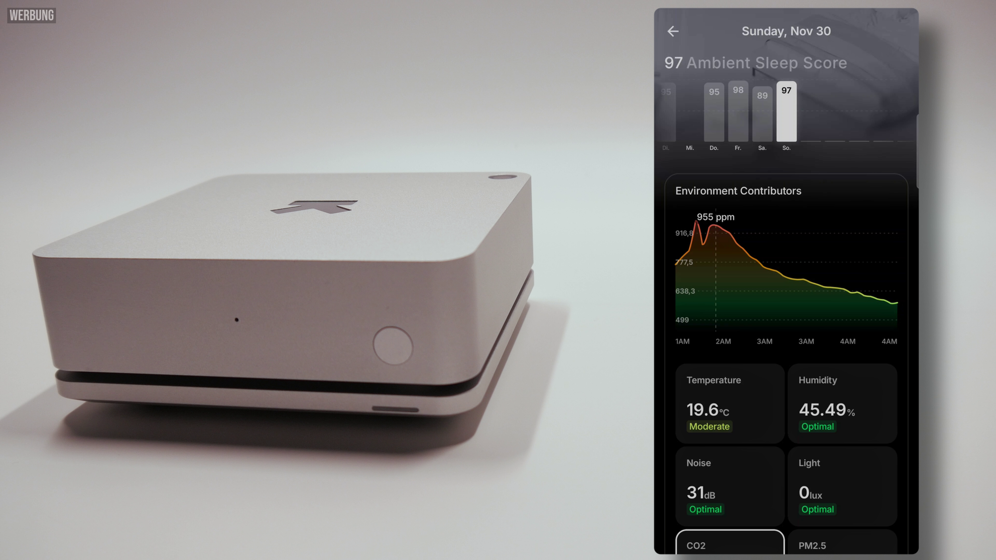 Der Ultrahuman HOME ist im Kern ein hochspezialisierter Umweltsensor, der eine beeindruckend große Menge an Daten über den Raum sammelt. Dazu gehören Luftparameter wie CO₂, Feinstaub, Formaldehyd, Rauchpartikel und verschiedene VOCs. Gerade CO₂ spielt eine enorme Rolle für die Schlafqualität und die Konzentrationsfähigkeit: Steigt der CO₂-Wert, sinkt die kognitive Leistung, Müdigkeit setzt schneller ein und die Schlafqualität verschlechtert sich nachweislich. Auch Temperatur und Luftfeuchtigkeit werden präzise erfasst, sodass sich schnell feststellen lässt, ob ein Raum zu warm, zu kalt, zu trocken oder zu feucht ist. Dies kann besonders nachts wichtige Hinweise auf Schlafprobleme oder Schimmelrisiken geben.